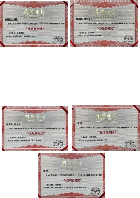 同时,中山市博爱医院检验科主任技师邓坤仪和佛山大学实习生李楠共同报送的案例《腹痛查因大会诊,细胞形态来“确诊”》;检验科主任技师陈燕辉和邓坤仪共同报送的案例《儿童恙虫病合并噬血细胞现象》;检验科主任技师陈燕辉和南方医院主任技师闫立志共同报送的案例《抽丝剥茧,精准取材,锁定真凶,破解迷雾》;检验科副主任技师刘继报送的案例《新生儿深陷溶血疑云,凶手竟是会“隐身”的“忍者”血型》、《血红蛋白25g/l,竟然是因为“它”》,因报送案例独特的代表性与广泛的实用性,获得了评审委员会的一致好评,荣获优秀案例奖。