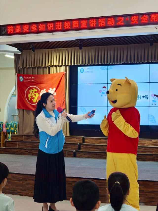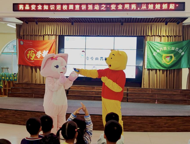 卡通人偶一登场,瞬间点燃了全场的热情!小朋友们眼睛发亮、欢呼雀跃,课堂气氛瞬间被推向高潮,变得愈发热烈活跃。药师团队与可爱的人偶默契配合,带来了精心编排的“安全用药小剧场”,将“别人的药不乱吃”“服药不掺果汁牛奶”等关键安全知识,通过生动有趣的情景演绎传递给孩子们,让大家在沉浸式体验中轻松加深认知。